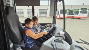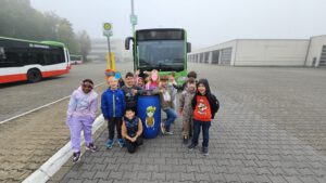 Die Klassen wurden mit einem Linienbus an der Schulbushaltestelle abgeholt und zum Busdepot des VRR nach Herten gebracht. Dort erfuhren die Kinder zunächst viel über den Ticketkauf, die Ausstattung eines Busses (Haltegriffe, Halteknöpfe, Entwerter, Nothammer und spezielle Sitzplätze) und das Verhalten bei einem Notfall. Anschließend ging es in die Werkstatt, wo beispielsweise pro Tag 10 Bussitze neu bezogen werden müssen. Nach einer kurzen Pause erlebten die Schüler*innen sehr anschaulich, wie wichtig es ist, Abstand vom Bus zu halten und sich bei der Fahrt festzuhalten: Bei einer Vollbremsung bei 20 km/h flog die Tonne Flo heftig durch die Luft! Nach einer Fahrt durch die Waschanlage ging es mit einem sauberen Bus zurück zur Schule. Auf der Rückfahrt haben sich viele Schüler*innen besonders gut festgehalten!
