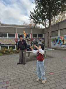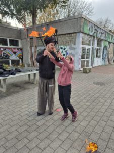 Anschließend durften die Schüler*innen ihren Mut beim Löschen von Fackeln beweisen. In verschiedenen kooperativen Spielen mit Fackeln und Feuer erweiterten sie ihre praktischen Erfahrungen und bauten Ängste vor dem Feuer ab. Sie bauten ihre Teamfähigkeit aus und lernten dabei auch, Verantwortung für sich und andere zu übernehmen.