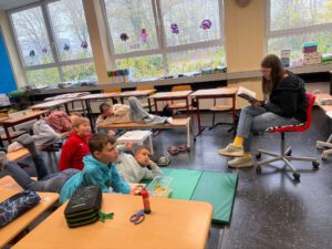 Nach der Fragerunde las Herr Schwabe den Kindern der 4b aus dem Buch „Zwei sind eine Bande“ von der Autorin Jasmin Schaudinn vor. In dem Buch geht es um Freundschaft, Zusammenhalt und darum, wie die Kinder Kofi und Lille die Probleme der Erwachsenen lösen.