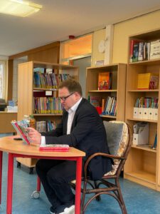 Am 18.11.2025 besuchte Herr Schwabe, Bundestagsabgeordneter für die Städte Recklinghausen, Waltrop und Castrop-Rauxel, die HCA. Da er am bundesweiten Vorlesetag keine Zeit hatte, kam er schon drei Tage vorher in die Schülerbücherei der Schule.