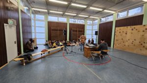 Am 10.12.2025 verwandelte sich die Turnhalle in ein Tonstudio. Jede Stufe übte im Vorfeld ein bis zwei Weihnachtslieder, die dann von zwei Mitarbeitern von „Gugelhupf Kinderlieder“ professionell aufgenommen wurden. Das Singen und Aufnehmen hat allen Beteiligten sehr viel Spaß gemacht.